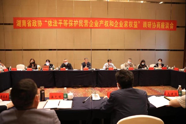 随后,调研组与邵阳市委、市政府相关部门负责人召开调研协商座谈会,听取邵阳市依法平等保护民营企业合法权益的工作情况介绍。调研组成员将企业反映的情况进行分类梳理,并与相关市直部门现场协商、交流意见。